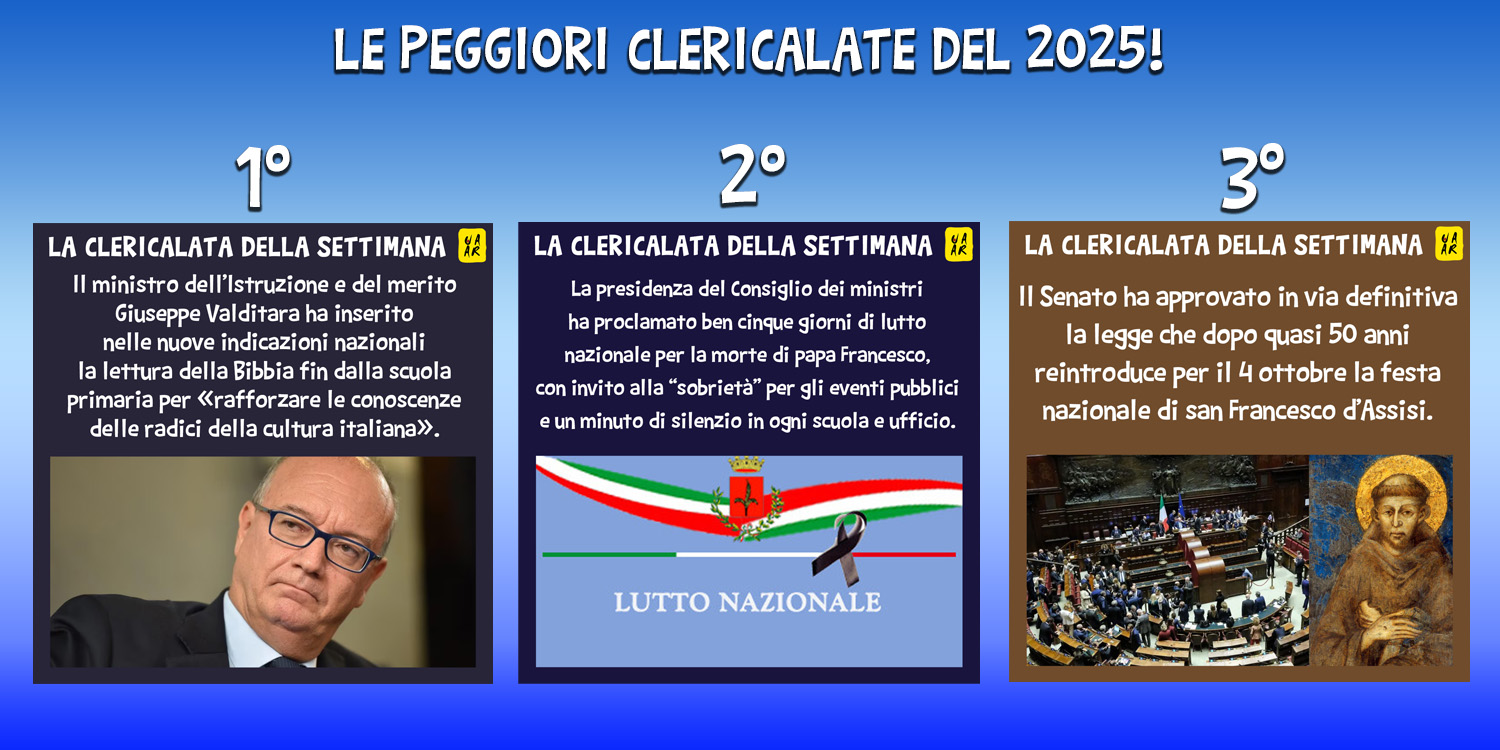 A vincere per la peggior clericalata del 2025, tra le 51 selezionate, è stato il ministro dell’Istruzione e del Merito Giuseppe Valditara per avere ideato l’introduzione dal prossimo anno scolastico dello studio di un’antologia della Bibbia nelle scuole elementari, anche fuori dall’Insegnamento della religione cattolica. La proposta ideologica di Valditara, che paragona il testo sacro all’epica classica come l’Iliade e l’Odissea, è stata votata con il 24,75% delle preferenze.